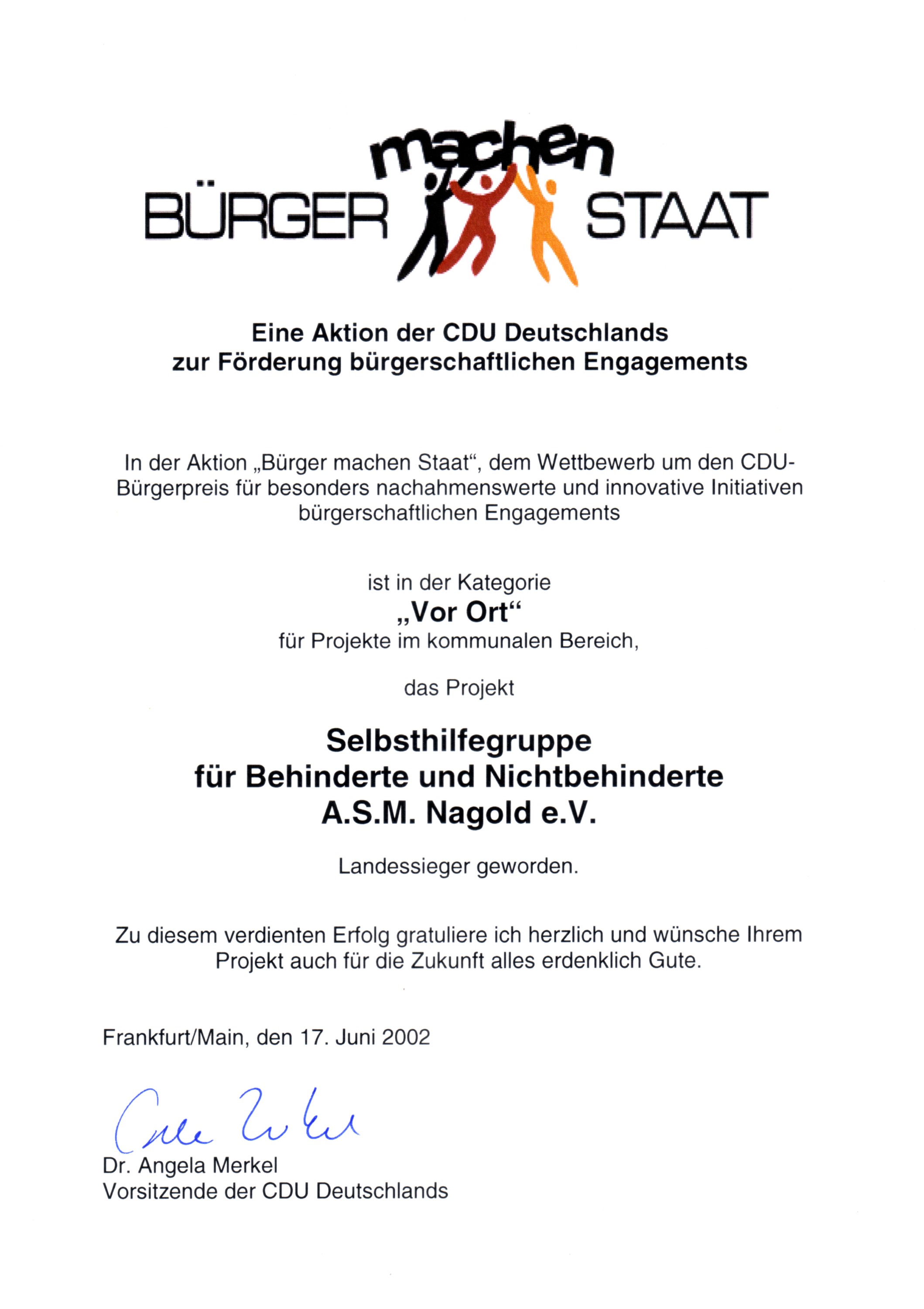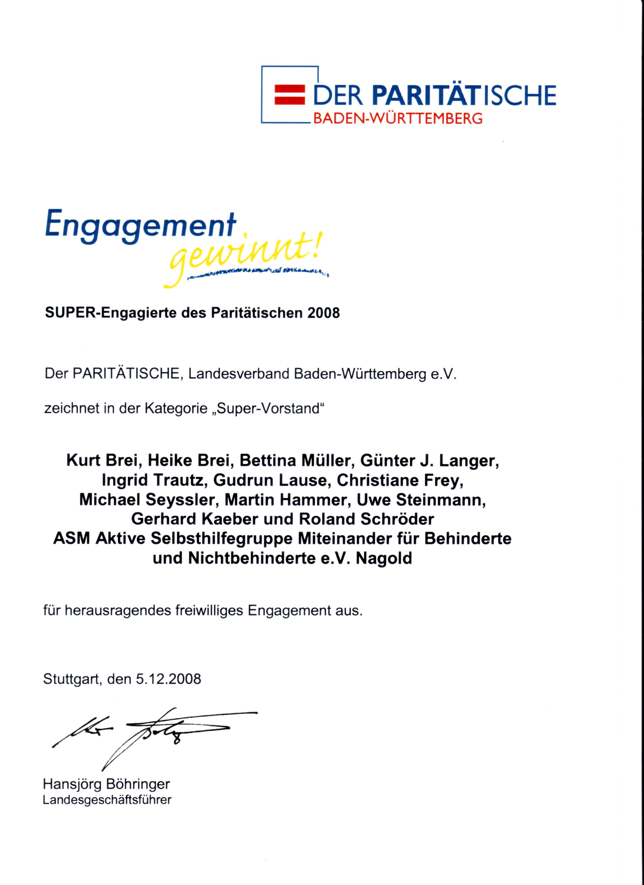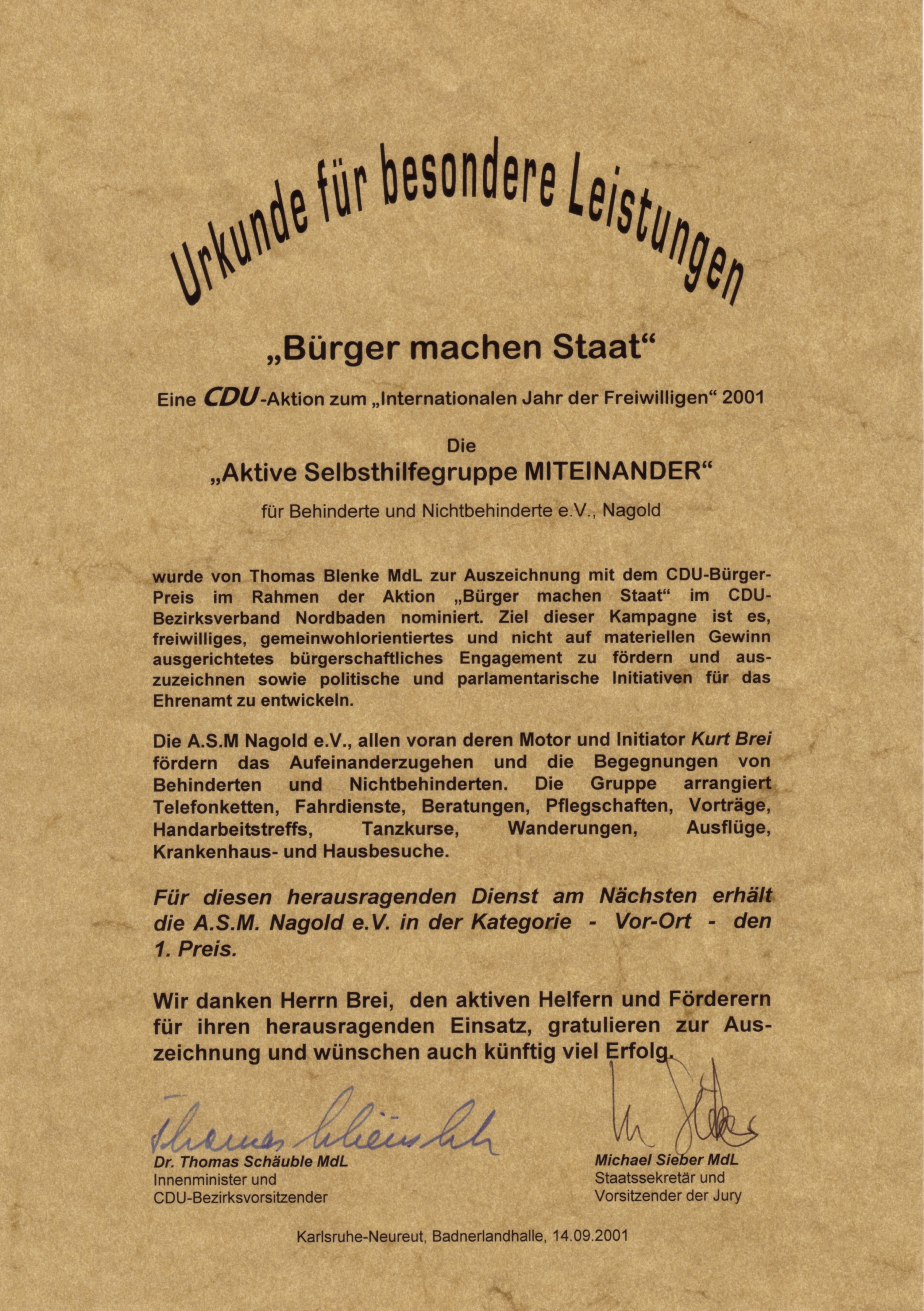 Die Aktive Selbsthilfegruppe Miteinander für Behinderte und Nichtbehinderte e.V. Nagold und ihre Mitglieder haben in der langjährigen Geschichte des Vereins viele Ehrungen und Auszeichnungen erhalten. Die schönste Auszeichnung erhält die A.S.M. jedoch tagtäglich durch die Arbeit mit den Menschen.