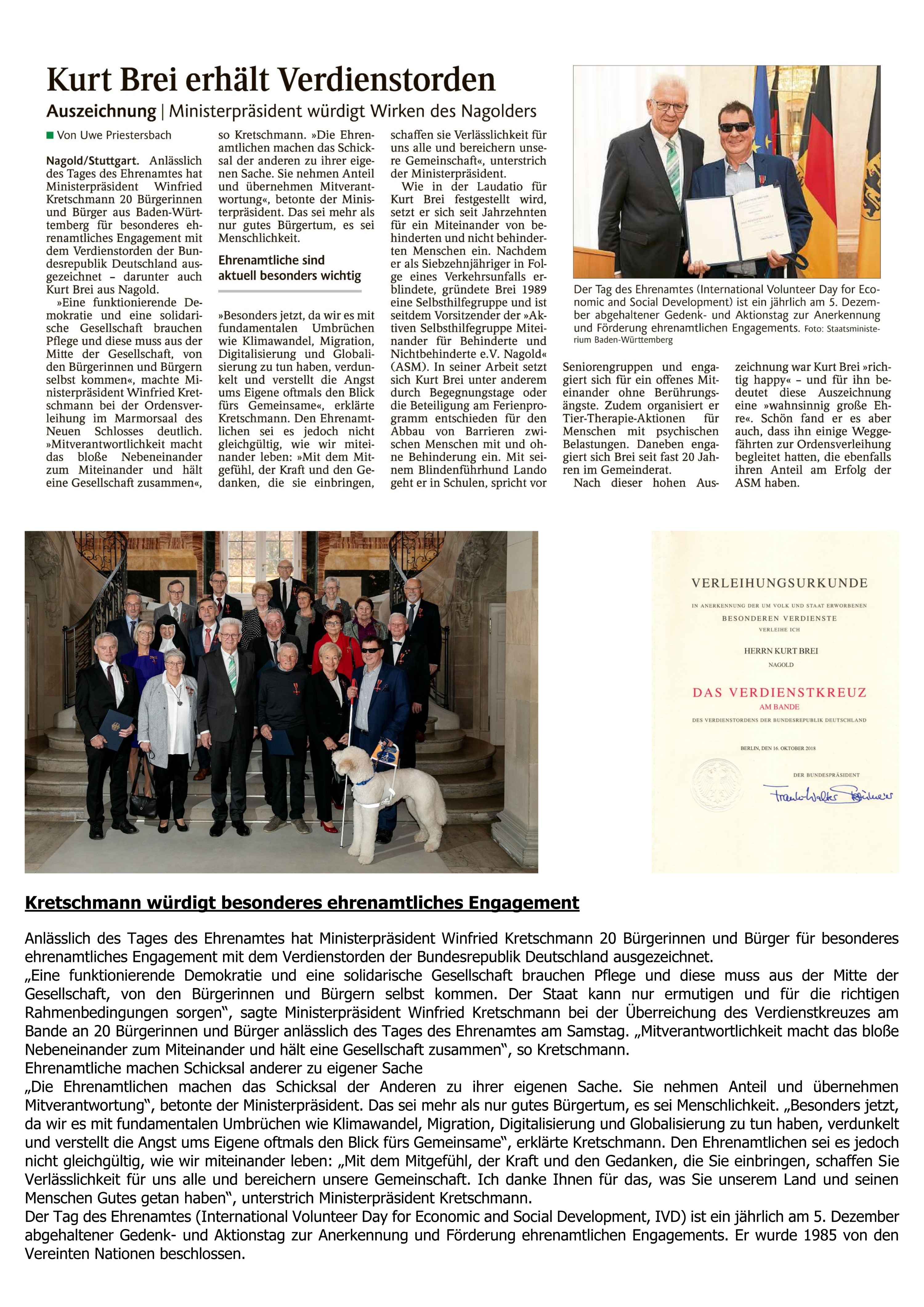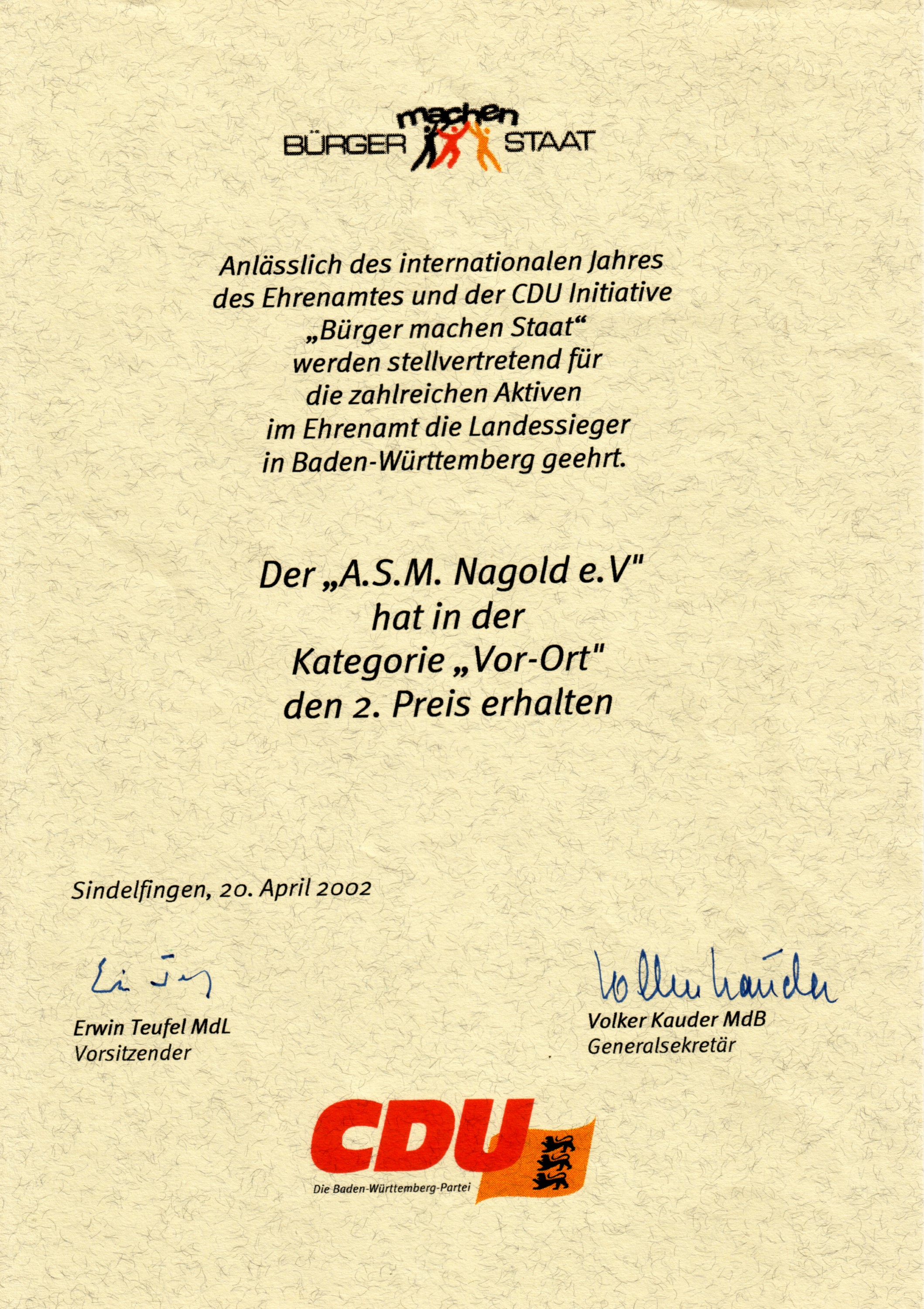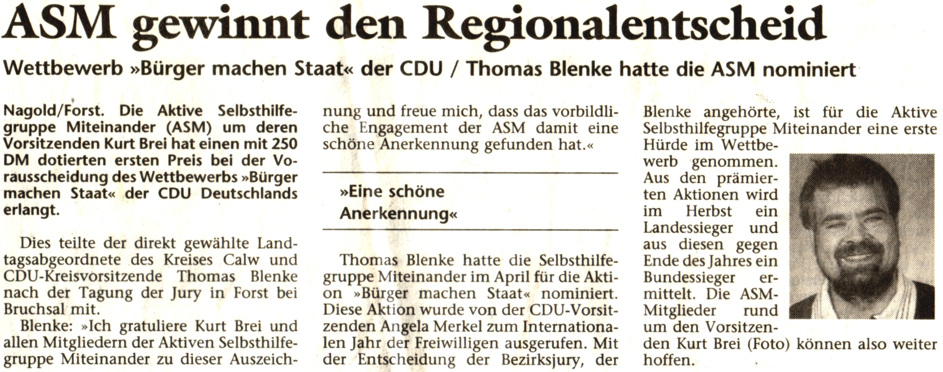 Die Aktive Selbsthilfegruppe Miteinander für Behinderte und Nichtbehinderte e.V. Nagold und ihre Mitglieder haben in der langjährigen Geschichte des Vereins viele Ehrungen und Auszeichnungen erhalten. Die schönste Auszeichnung erhält die A.S.M. jedoch tagtäglich durch die Arbeit mit den Menschen.