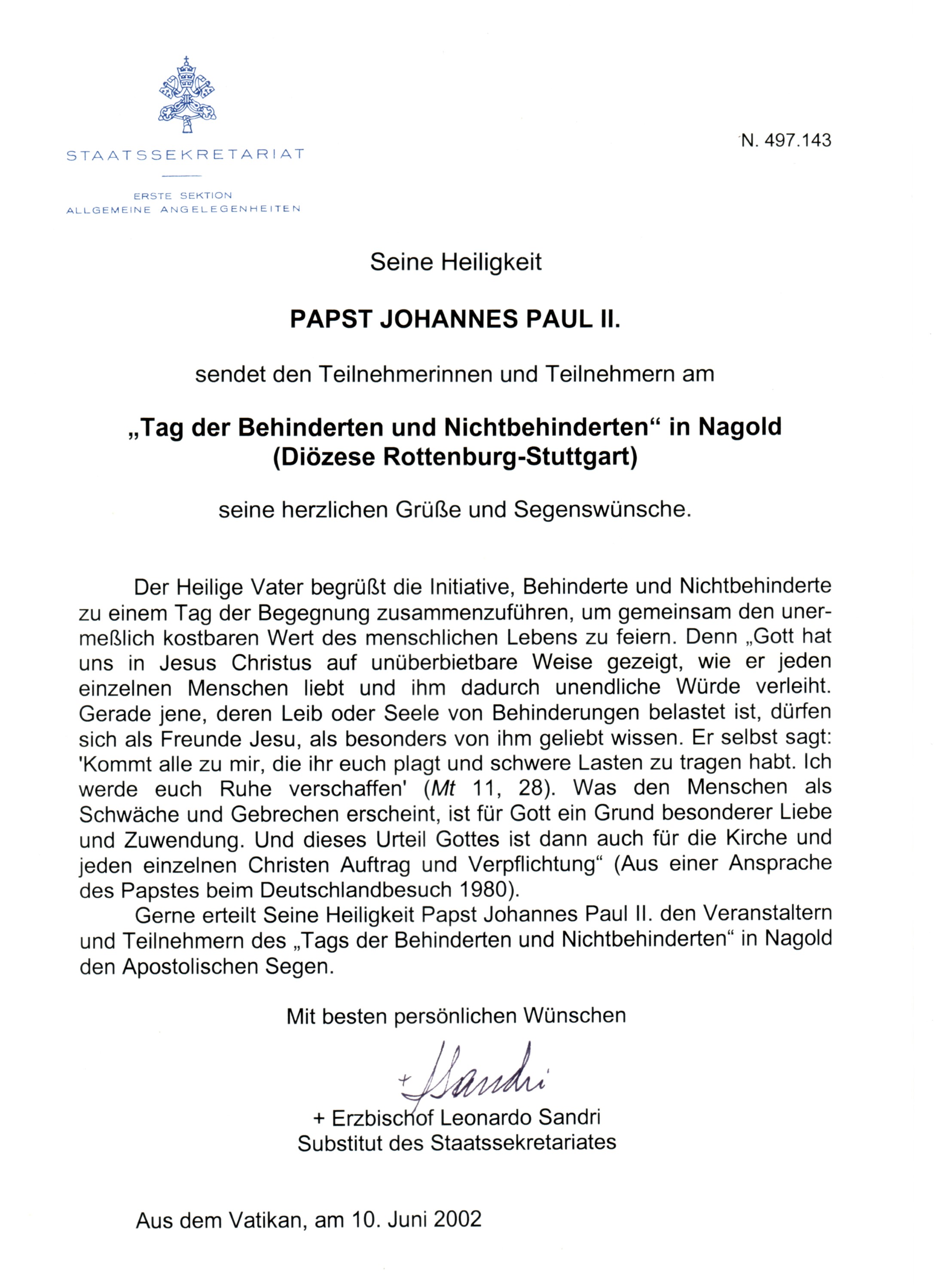 04. "Segenswünsche von Papst Johannes Paul II." zum Tag der Begegnung