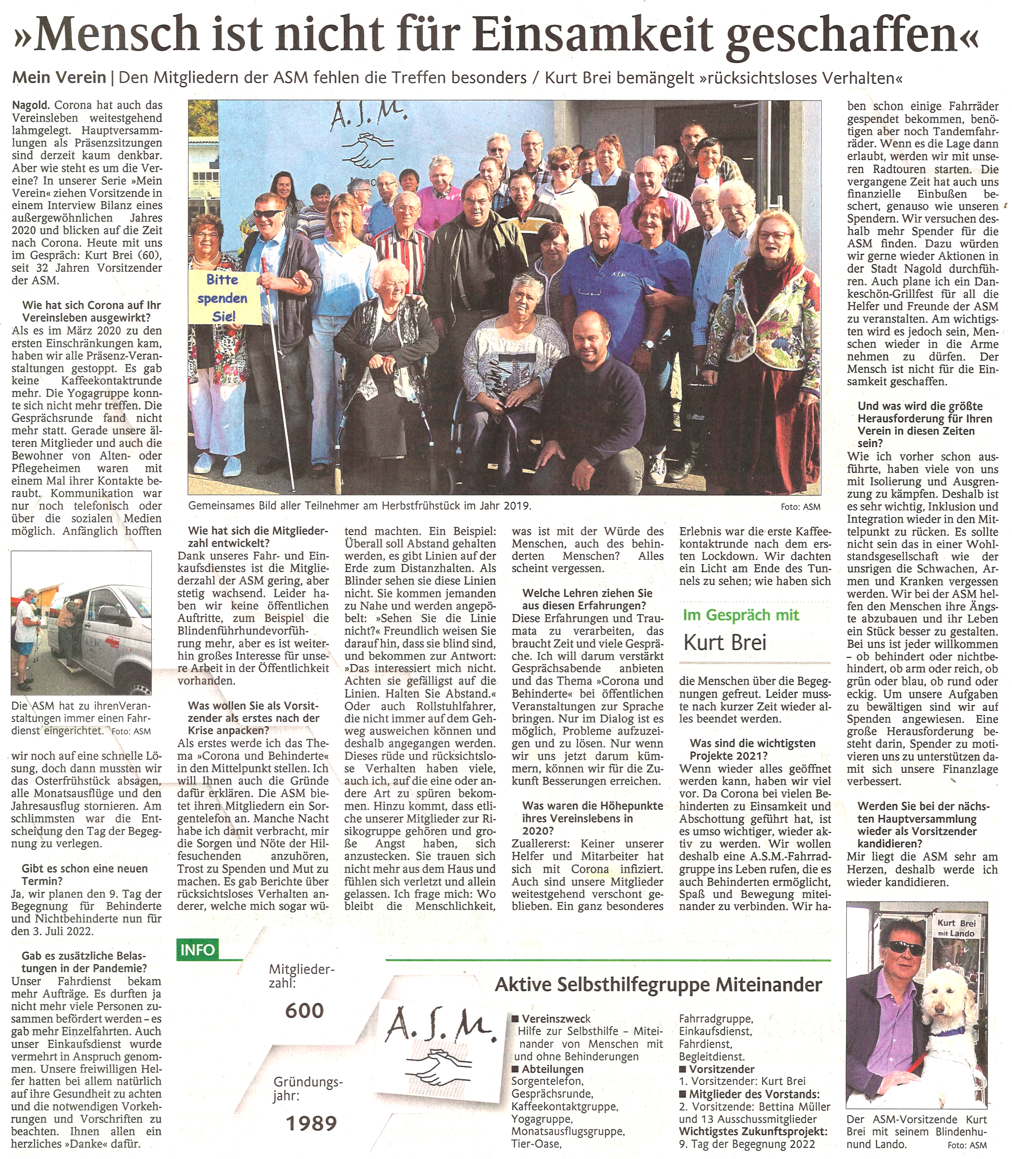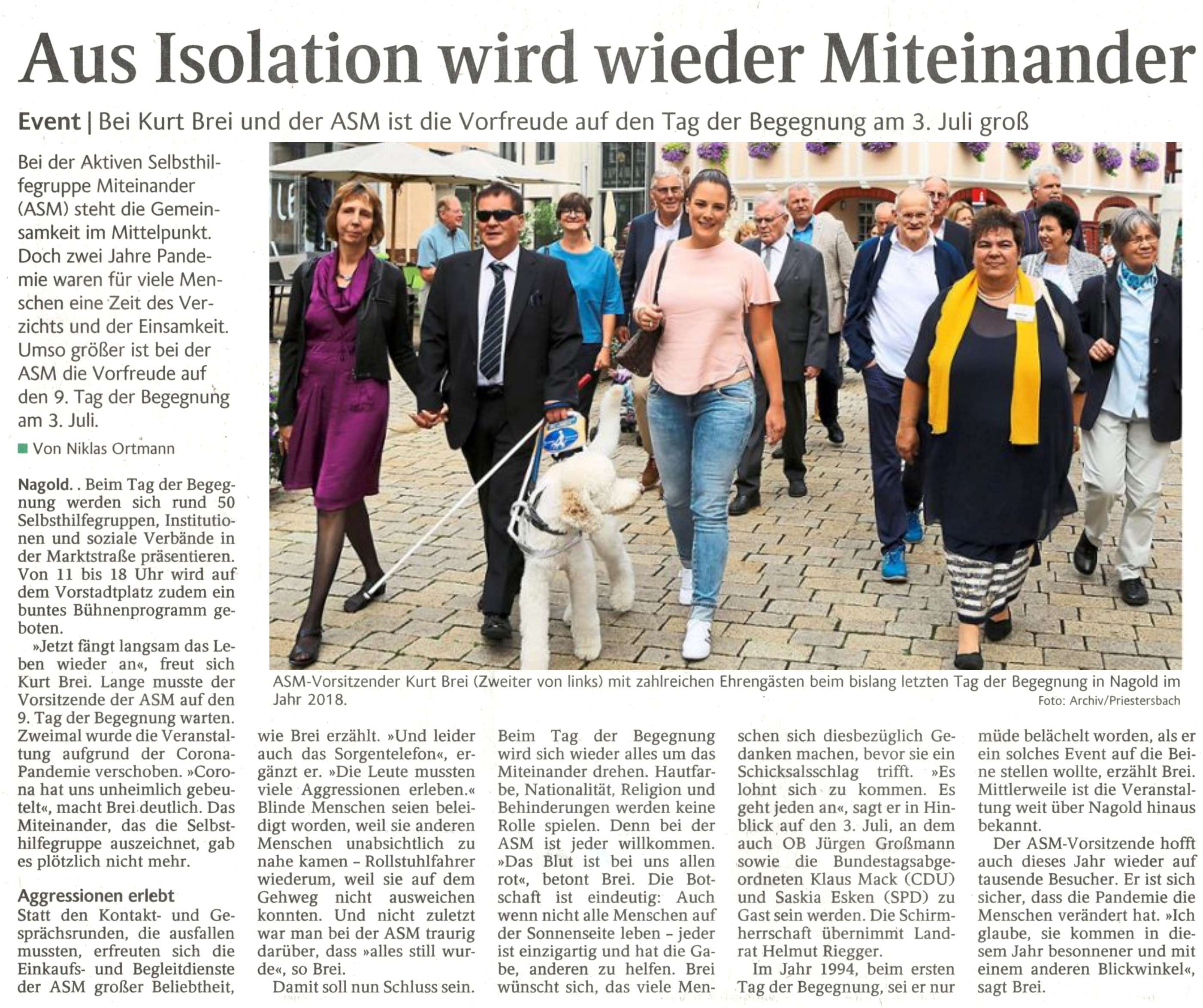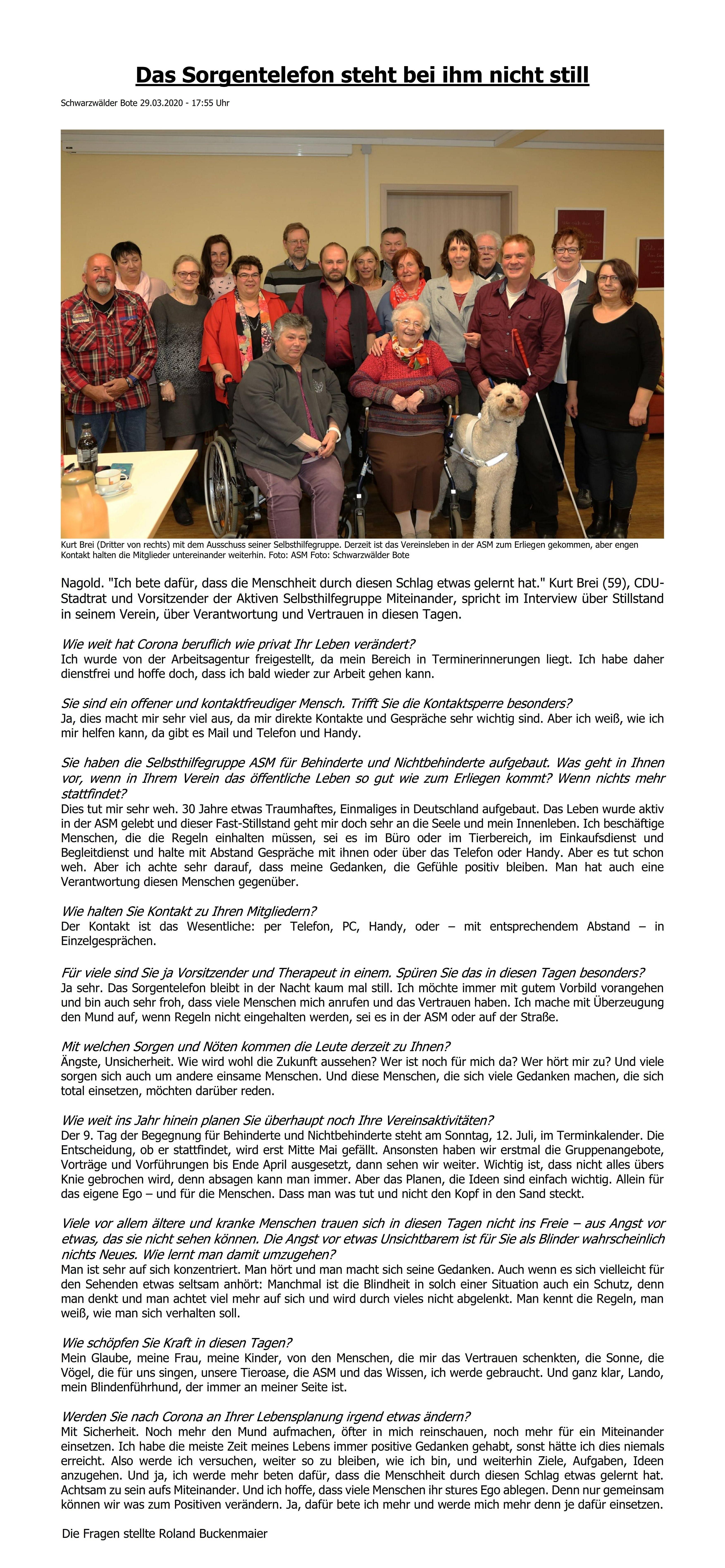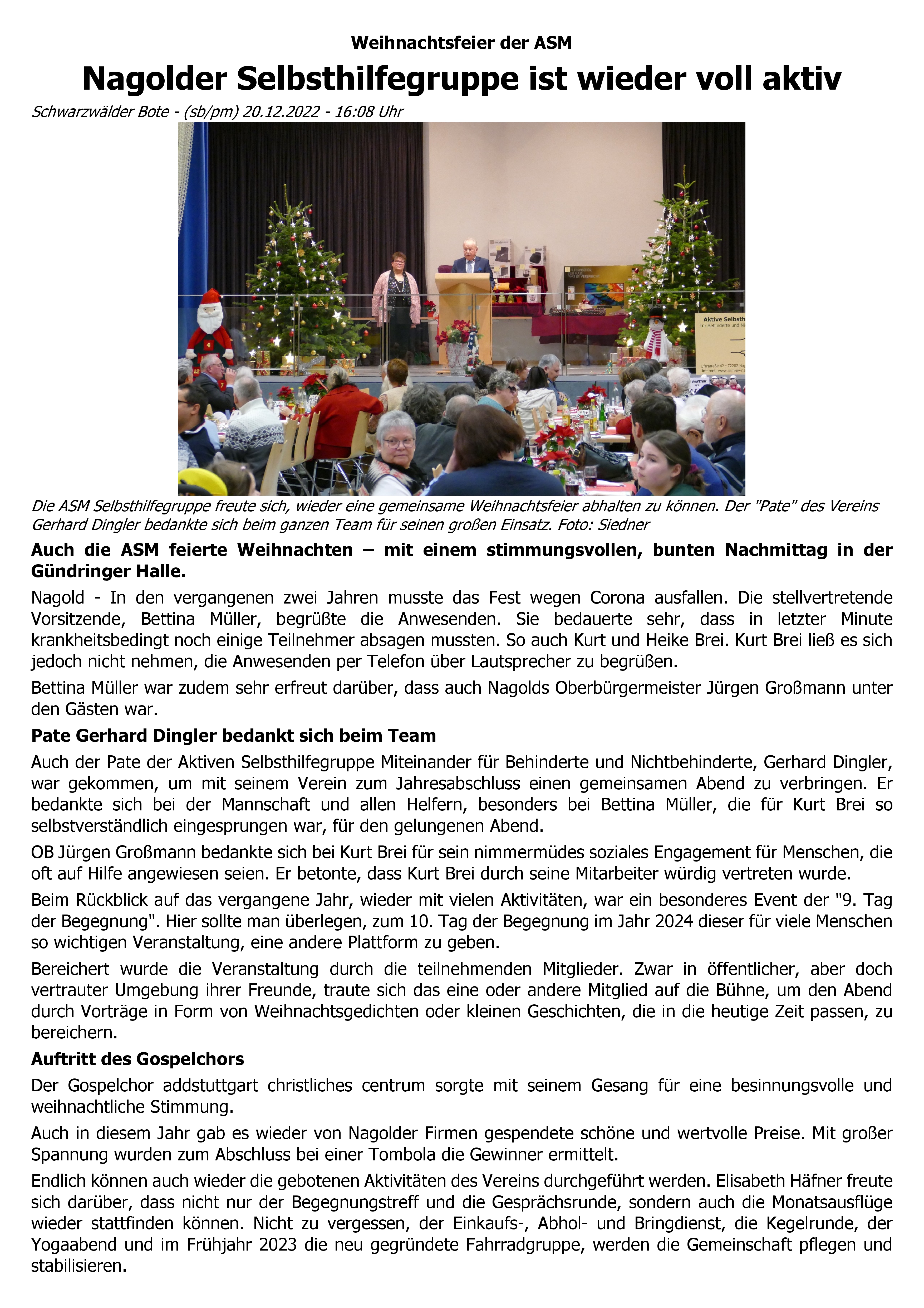 15. "Selbsthilfegruppe dankt ihren Mitstreitern..."14. "Nagolder Selbsthilfegruppe ist wieder voll aktiv" - Schwarzwälder Bote 20.12.202213. Engagierte MEVA-Azubis - Erfolgreiche Aktionen ermöglichen großzügige Spenden12. "Ein Marktplatz der Hilfsangebote" - Schwarzwälder Bote 05.07.202211. "Aus der Isolation wird wieder ein Miteinander" - Schwarzwälder Bote 25.05.202210. "Der ASM bleibt sie weiter verbunden" - Schwarzwälder Bote 01.09.202109. "Mensch ist nicht für die Einsamkeit geschaffen" - Schwarzwälder Bote 18.05.202108. "Kurt Brei und seine Liebe zu dieser Stadt" - Schwarzwälder Bote 26.01.202107. "Kurt Brei betrachtet jeden Tag als Geschenk"06. Corona: "Die kritische Phase kommt noch"05. "Bündnis formt sich um Corona-Sozialfonds"04. "Keine schnelle Rückkehr zum Alltag"03. "Eine willkommen Unterstützung für die ASM"02. "Das Sorgentelefon steht bei ihm nicht still"01. "Wie eine große Familie"