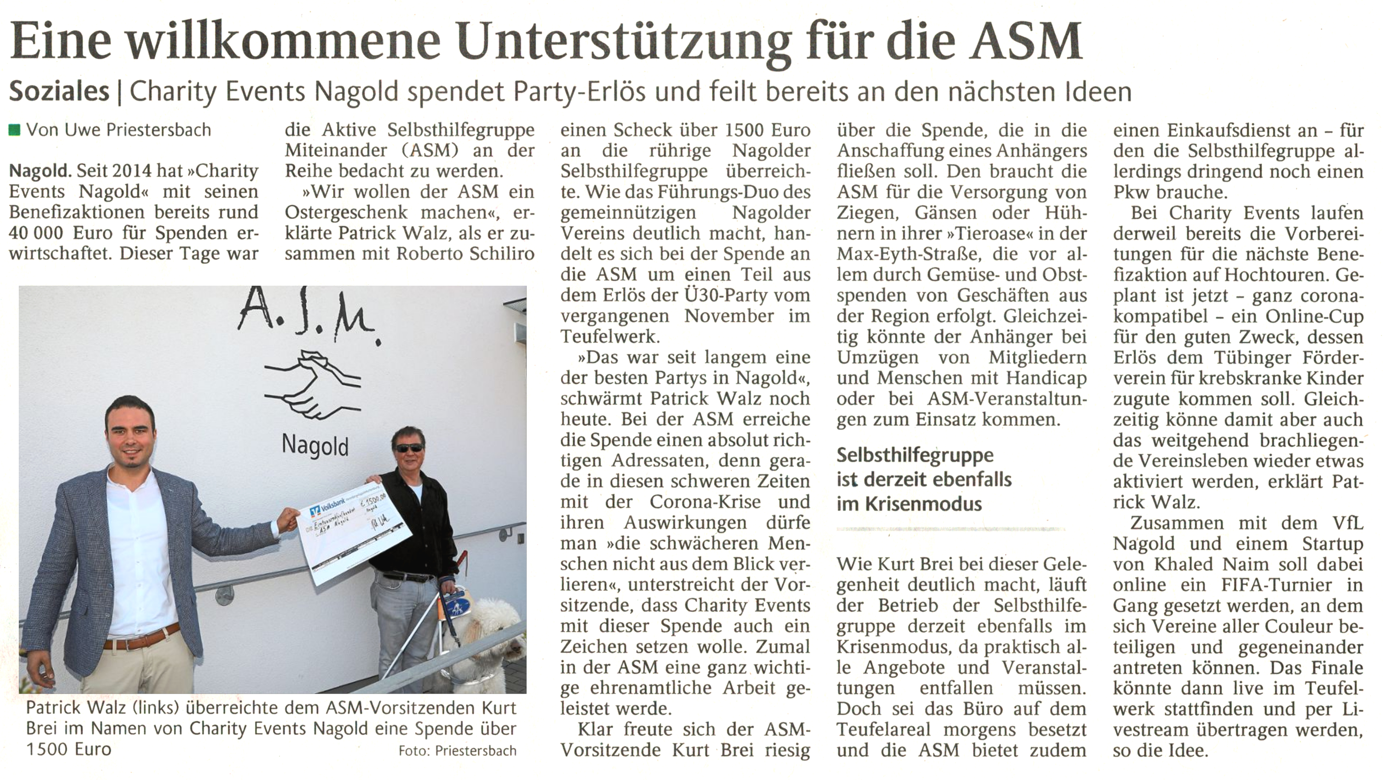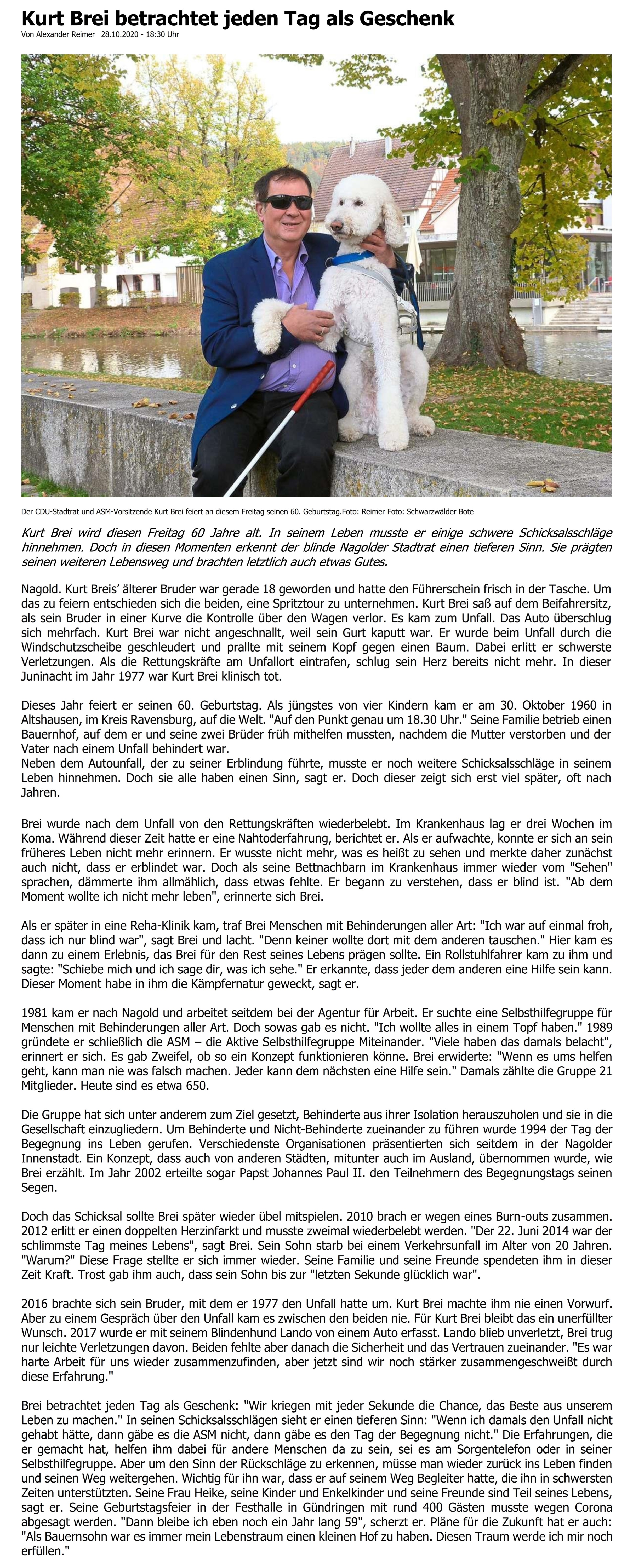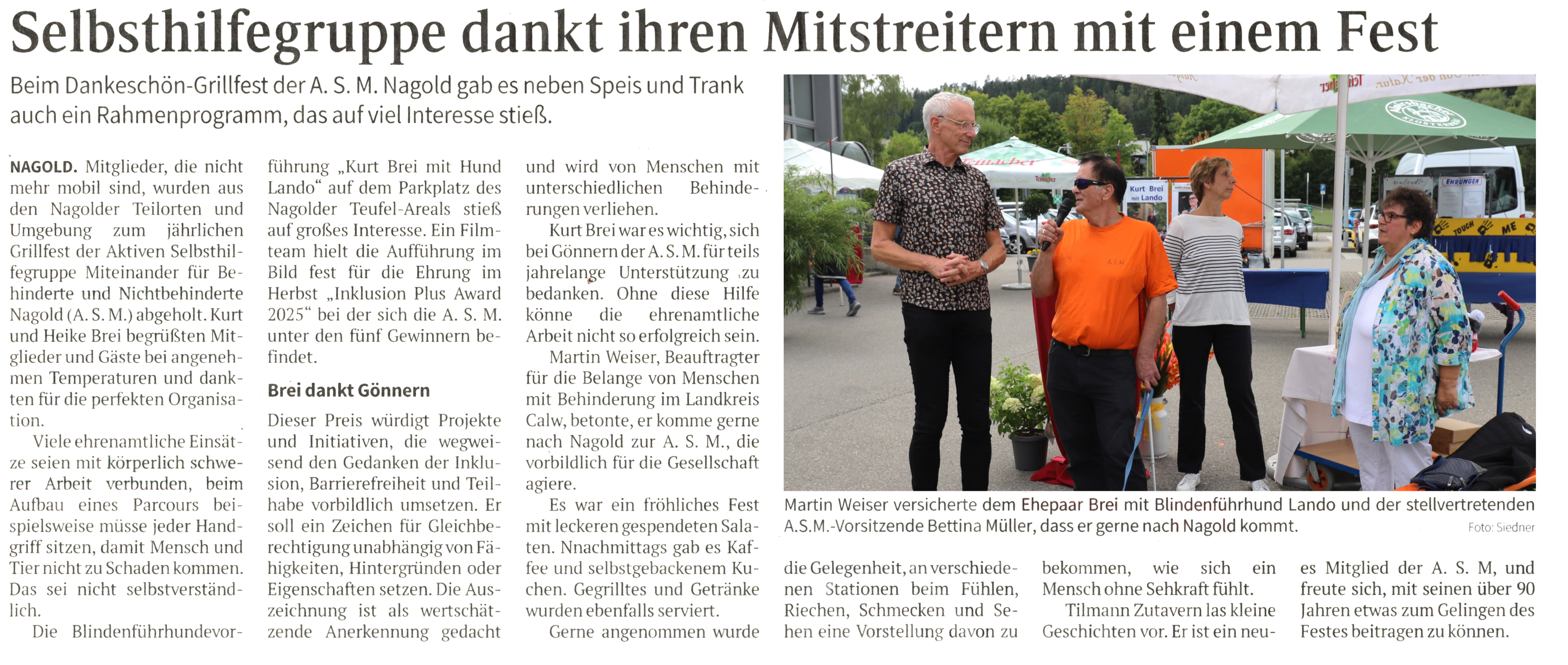 15. "Selbsthilfegruppe dankt ihren Mitstreitern..."14. "Nagolder Selbsthilfegruppe ist wieder voll aktiv" - Schwarzwälder Bote 20.12.202213. Engagierte MEVA-Azubis - Erfolgreiche Aktionen ermöglichen großzügige Spenden12. "Ein Marktplatz der Hilfsangebote" - Schwarzwälder Bote 05.07.202211. "Aus der Isolation wird wieder ein Miteinander" - Schwarzwälder Bote 25.05.202210. "Der ASM bleibt sie weiter verbunden" - Schwarzwälder Bote 01.09.202109. "Mensch ist nicht für die Einsamkeit geschaffen" - Schwarzwälder Bote 18.05.202108. "Kurt Brei und seine Liebe zu dieser Stadt" - Schwarzwälder Bote 26.01.202107. "Kurt Brei betrachtet jeden Tag als Geschenk"06. Corona: "Die kritische Phase kommt noch"05. "Bündnis formt sich um Corona-Sozialfonds"04. "Keine schnelle Rückkehr zum Alltag"03. "Eine willkommen Unterstützung für die ASM"02. "Das Sorgentelefon steht bei ihm nicht still"01. "Wie eine große Familie"