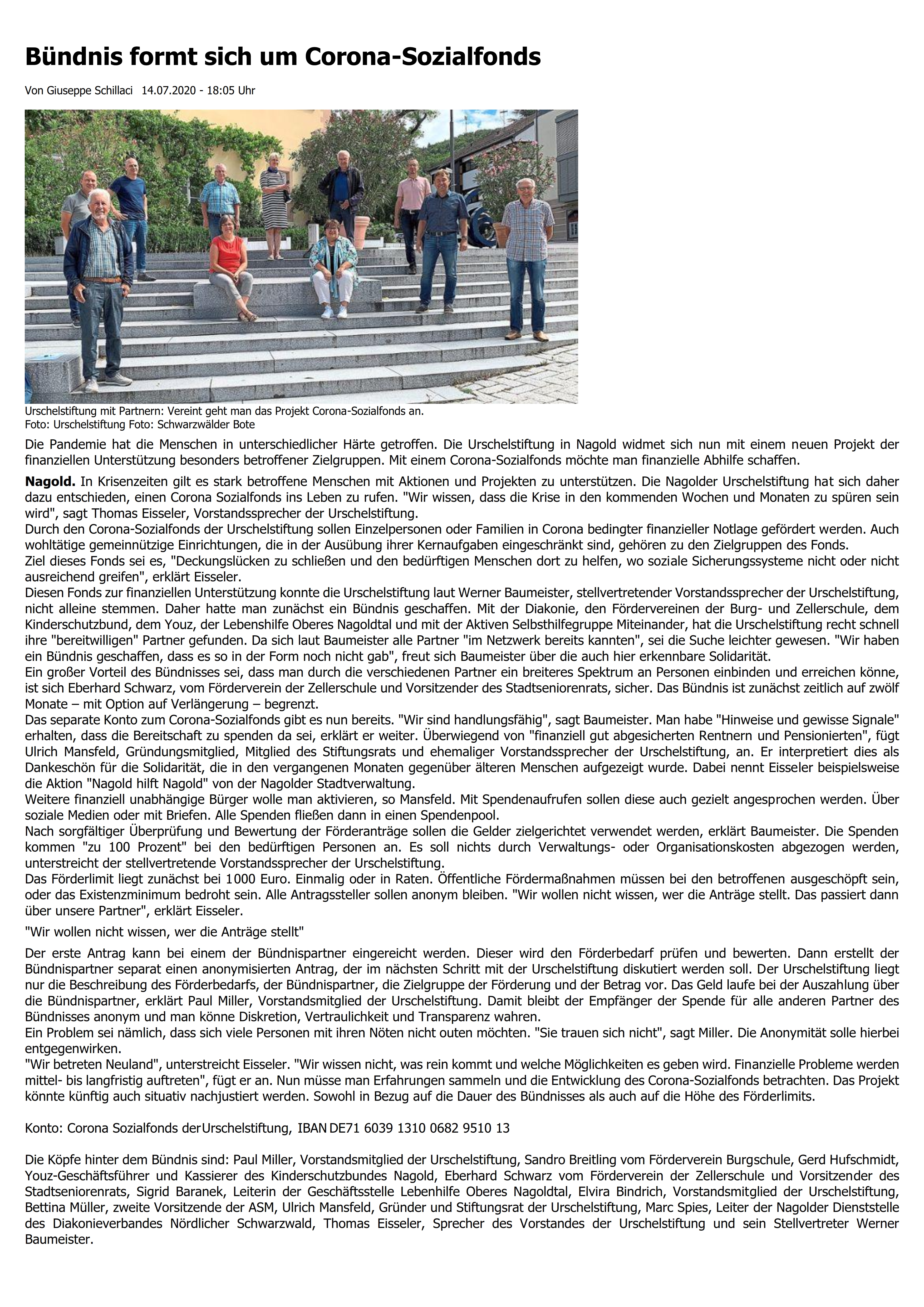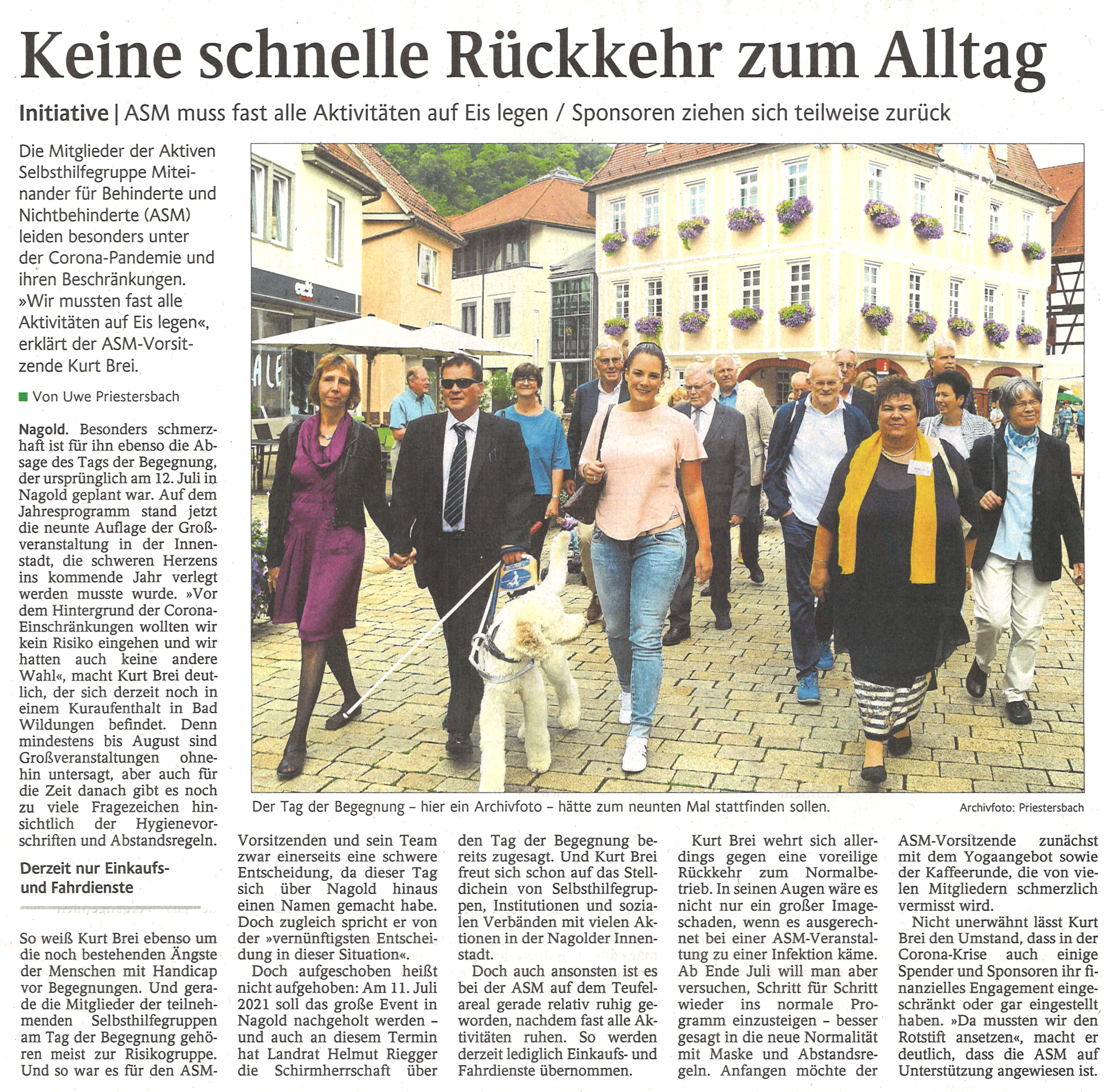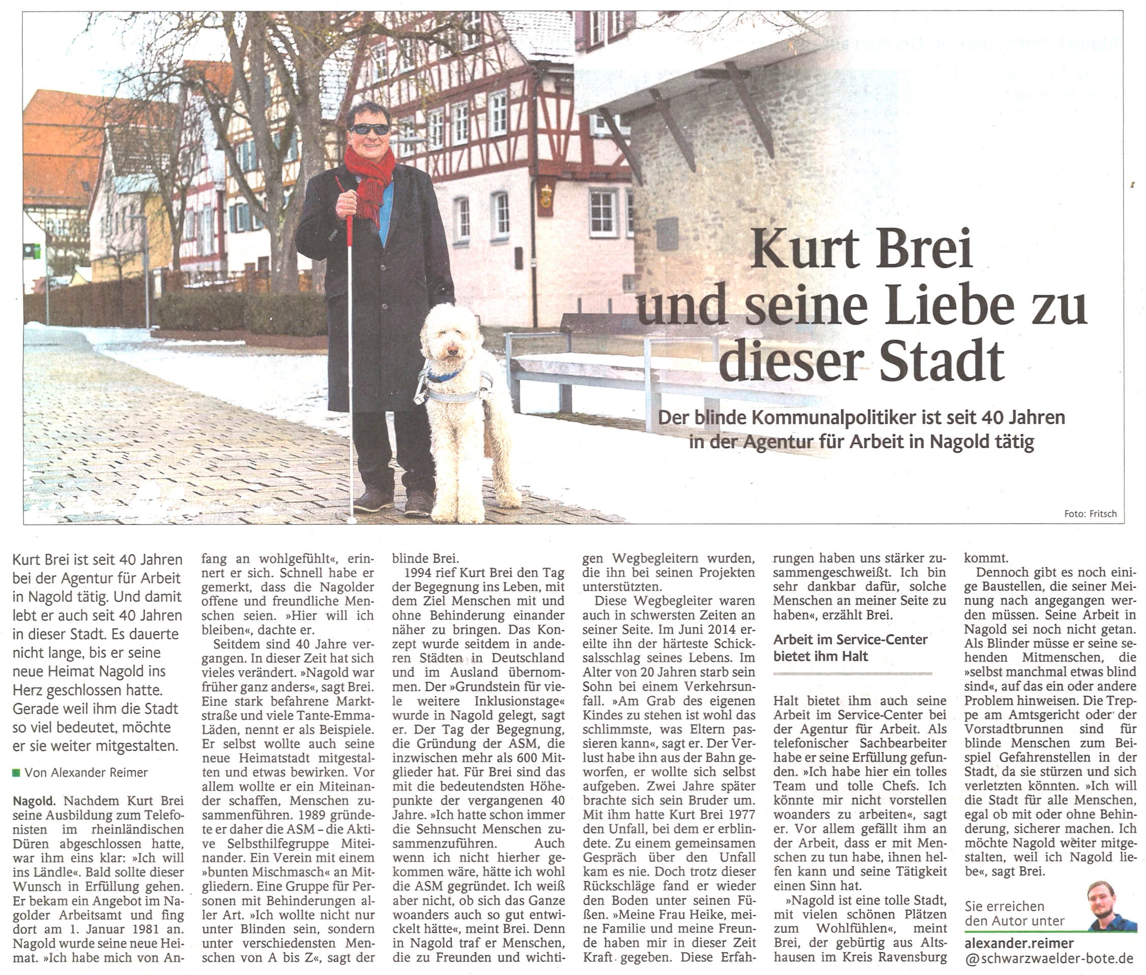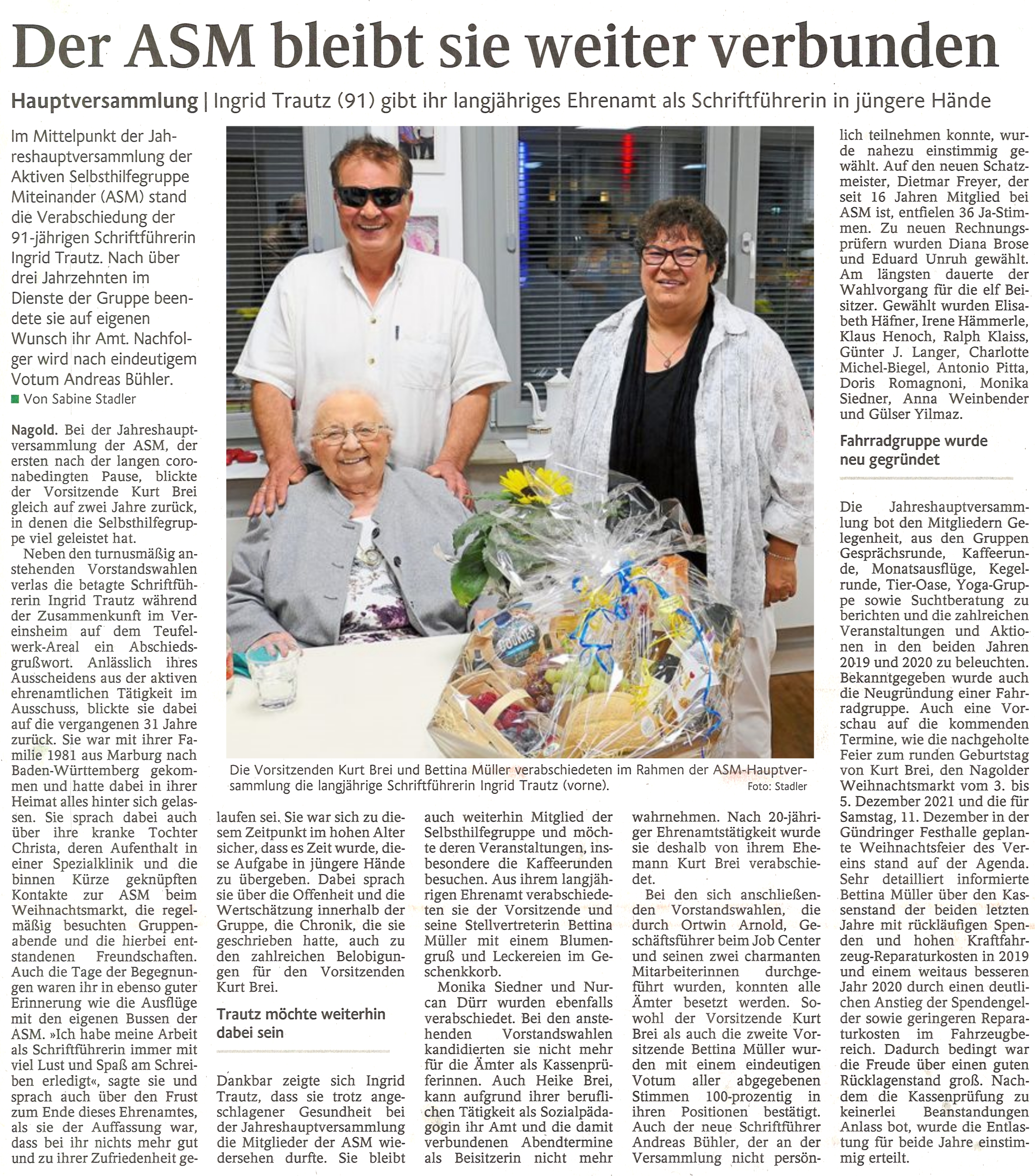 15. "Selbsthilfegruppe dankt ihren Mitstreitern..."14. "Nagolder Selbsthilfegruppe ist wieder voll aktiv" - Schwarzwälder Bote 20.12.202213. Engagierte MEVA-Azubis - Erfolgreiche Aktionen ermöglichen großzügige Spenden12. "Ein Marktplatz der Hilfsangebote" - Schwarzwälder Bote 05.07.202211. "Aus der Isolation wird wieder ein Miteinander" - Schwarzwälder Bote 25.05.202210. "Der ASM bleibt sie weiter verbunden" - Schwarzwälder Bote 01.09.202109. "Mensch ist nicht für die Einsamkeit geschaffen" - Schwarzwälder Bote 18.05.202108. "Kurt Brei und seine Liebe zu dieser Stadt" - Schwarzwälder Bote 26.01.202107. "Kurt Brei betrachtet jeden Tag als Geschenk"06. Corona: "Die kritische Phase kommt noch"05. "Bündnis formt sich um Corona-Sozialfonds"04. "Keine schnelle Rückkehr zum Alltag"03. "Eine willkommen Unterstützung für die ASM"02. "Das Sorgentelefon steht bei ihm nicht still"01. "Wie eine große Familie"