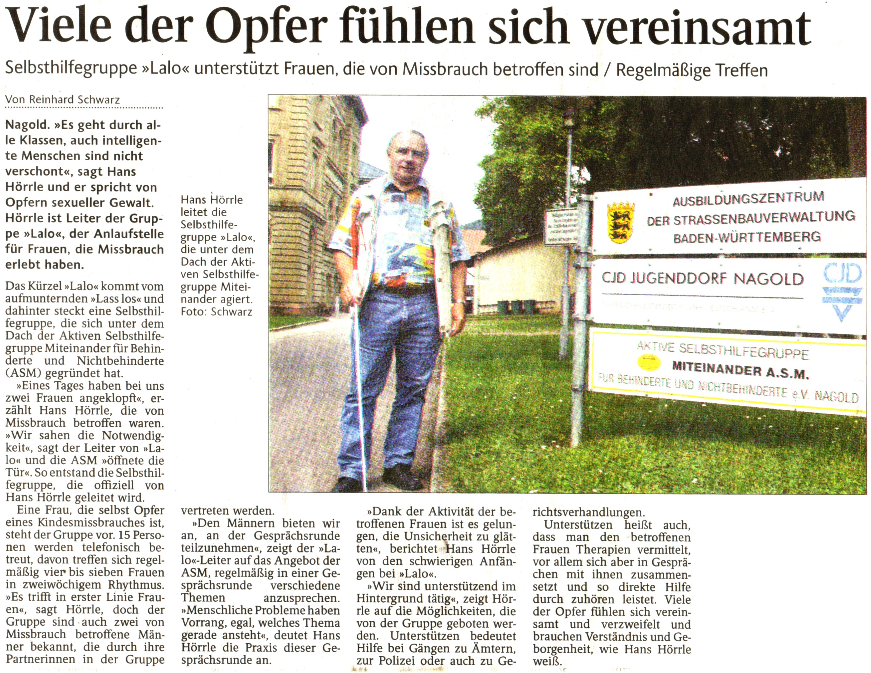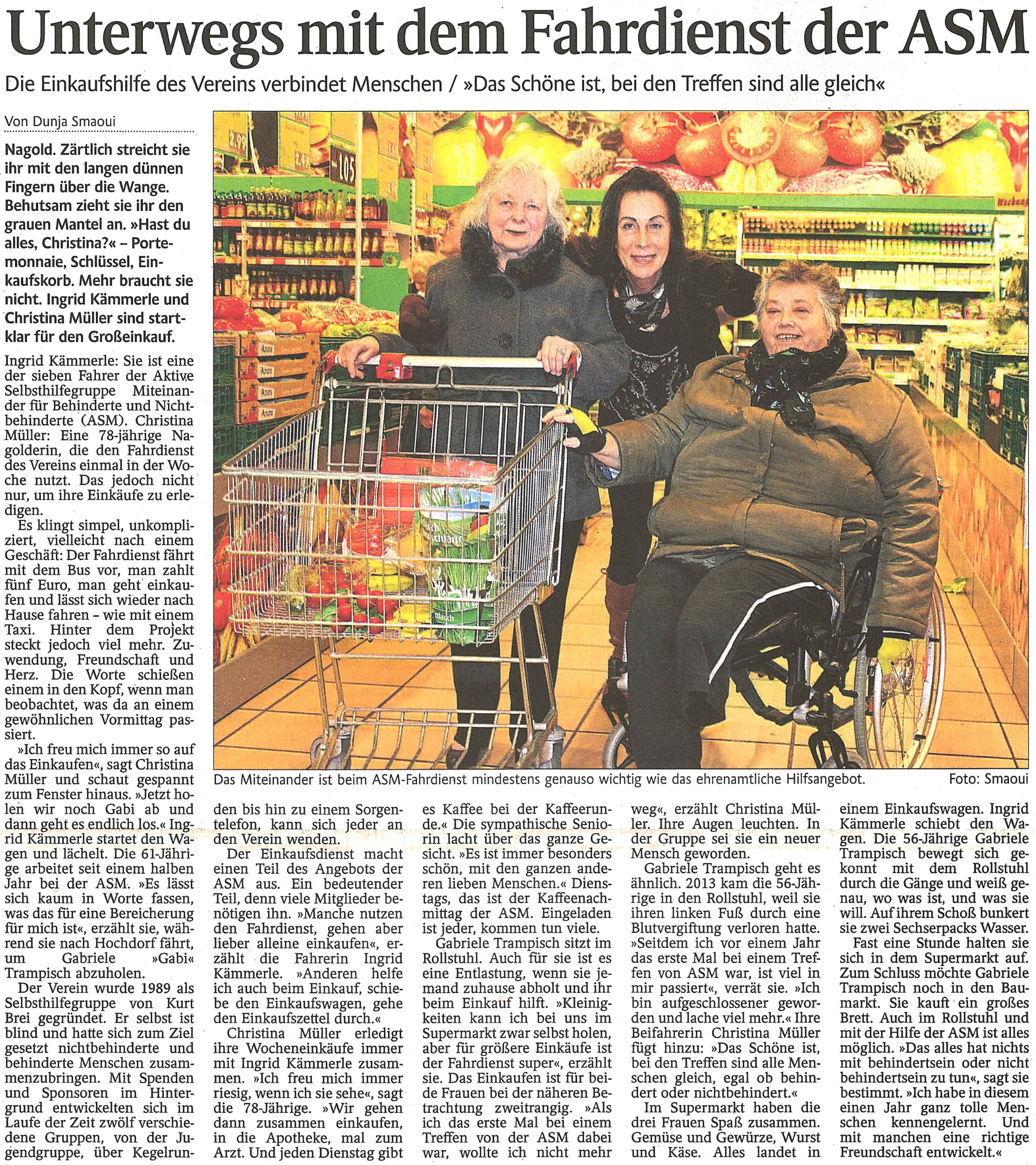 Viele Menschen leben alleine und kommen oft nicht dahin, wo sie hin müssen. Sei es durch eine Behinderung, aus Altersgründen oder aus Krankheit. Die A.S.M. bietet in diesem Bereich Begleitdienste für Gänge wie Einkaufen, Terminsachen bei Ärzten oder auch Spazieren gehen an. Der nachfolgende Zeitungsartikel stammt aus dem Schwarzwälder Boten vom 21.03.2015.